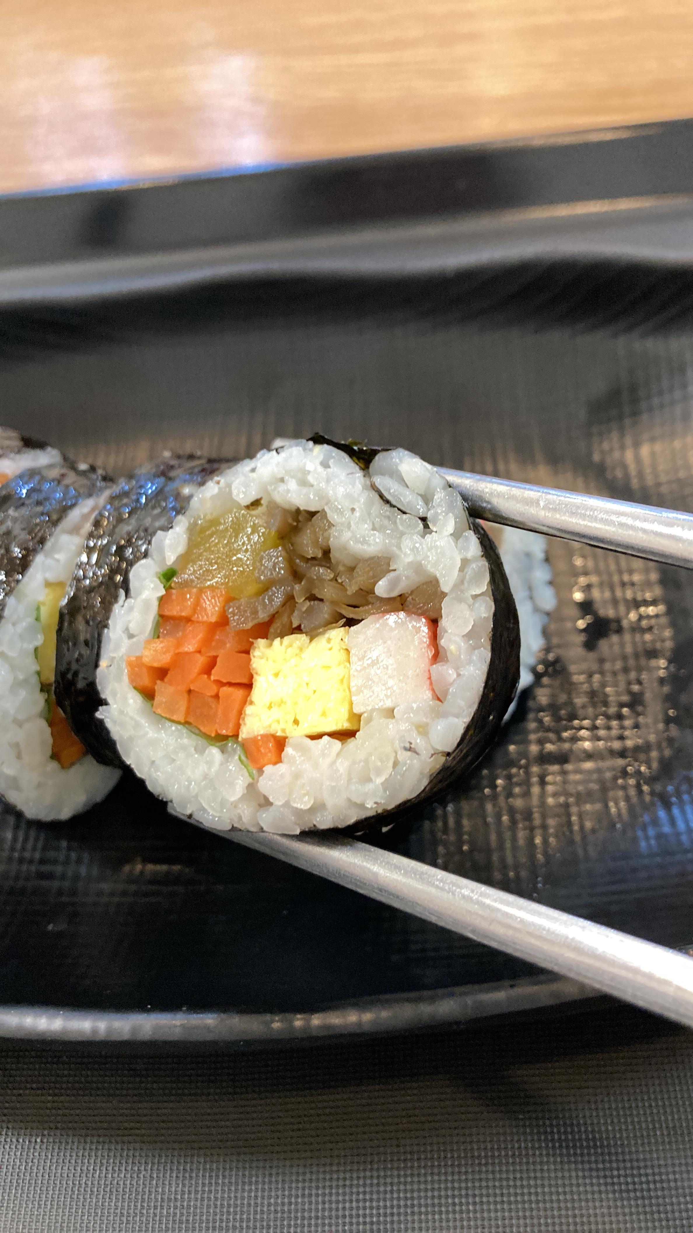 당근과 우엉이 가득하고 계란,맛살,단무지,깻잎이 들어간 언니야 김밥은