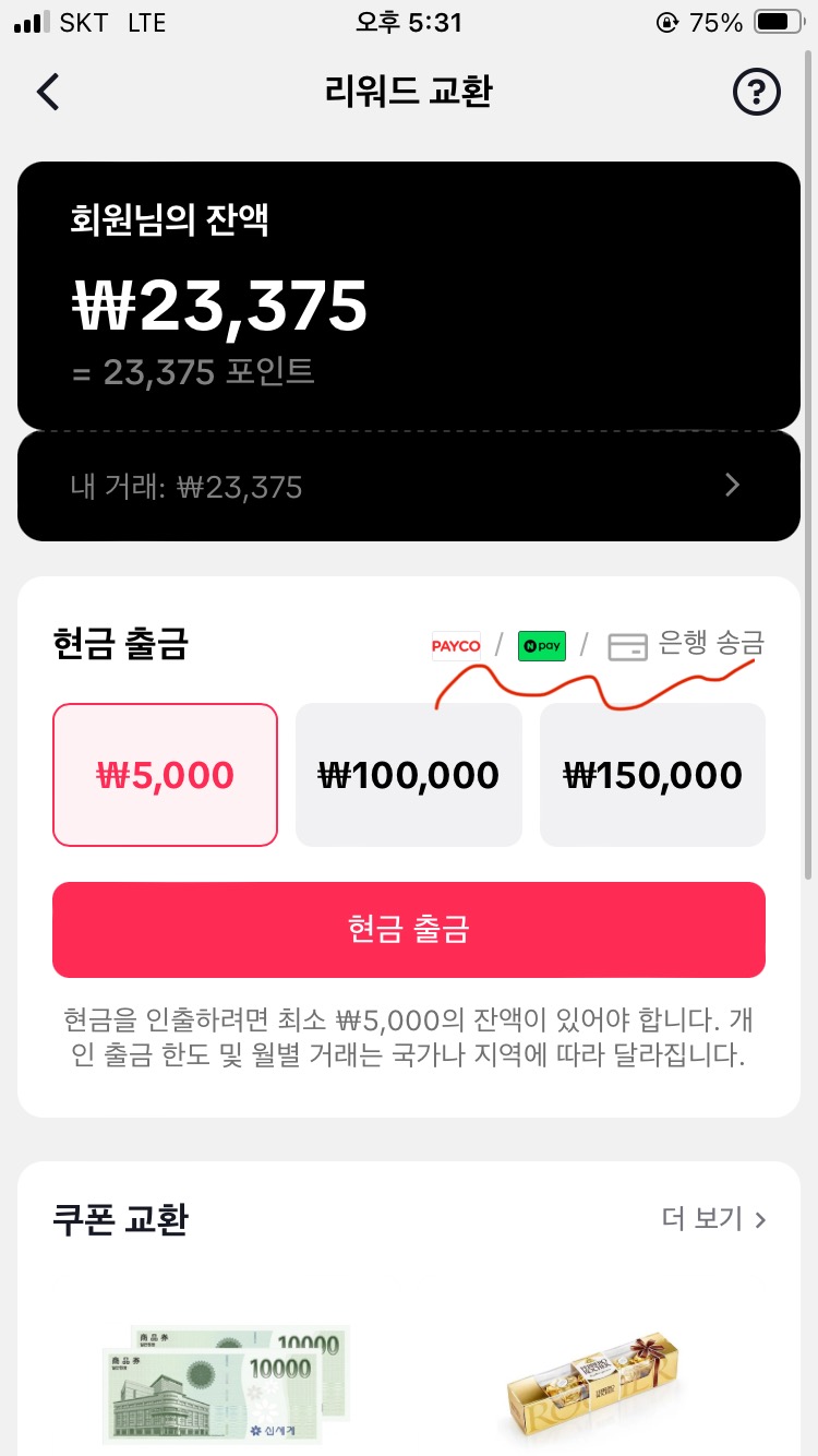 출금 단위는 5천원 십만원 십오만원 인데